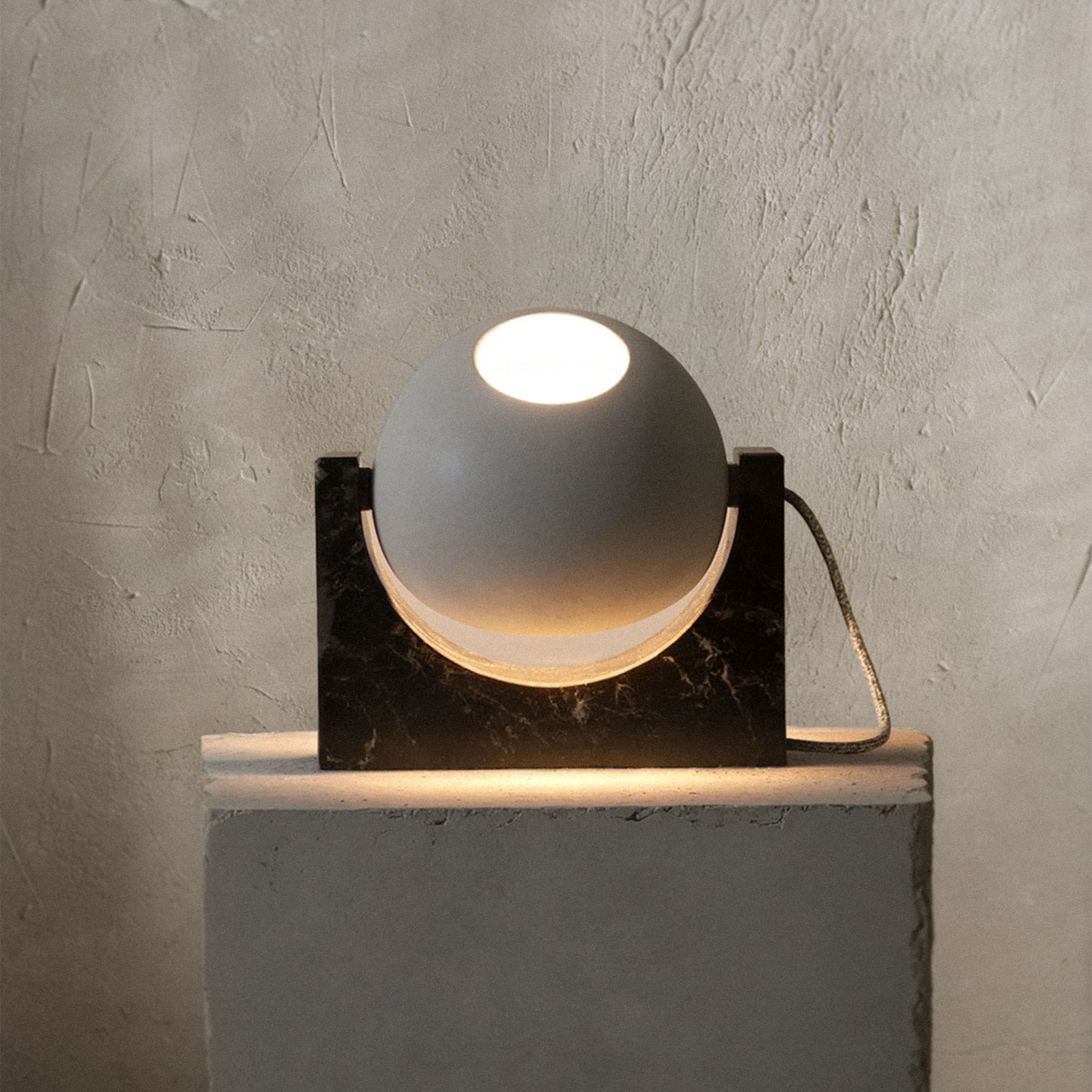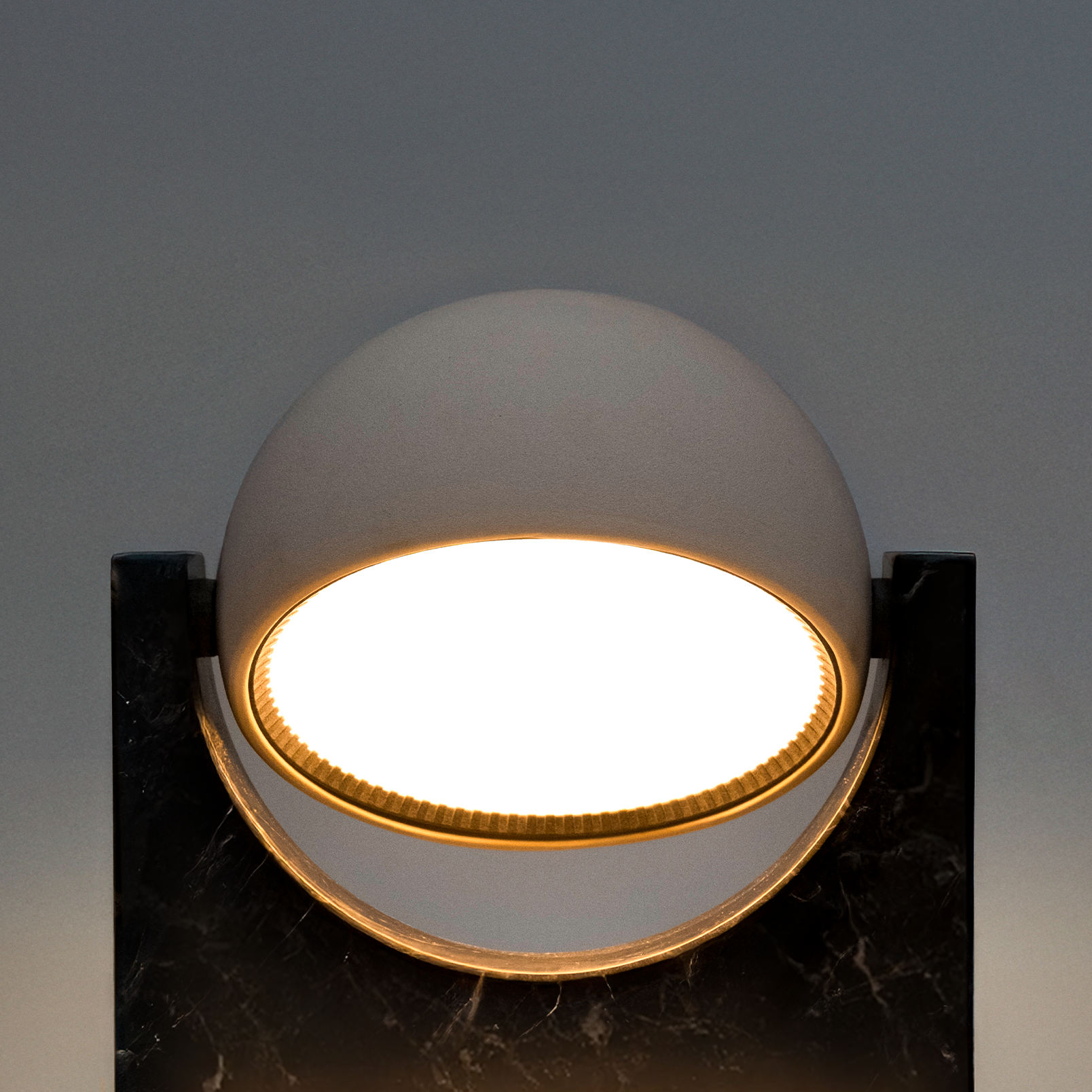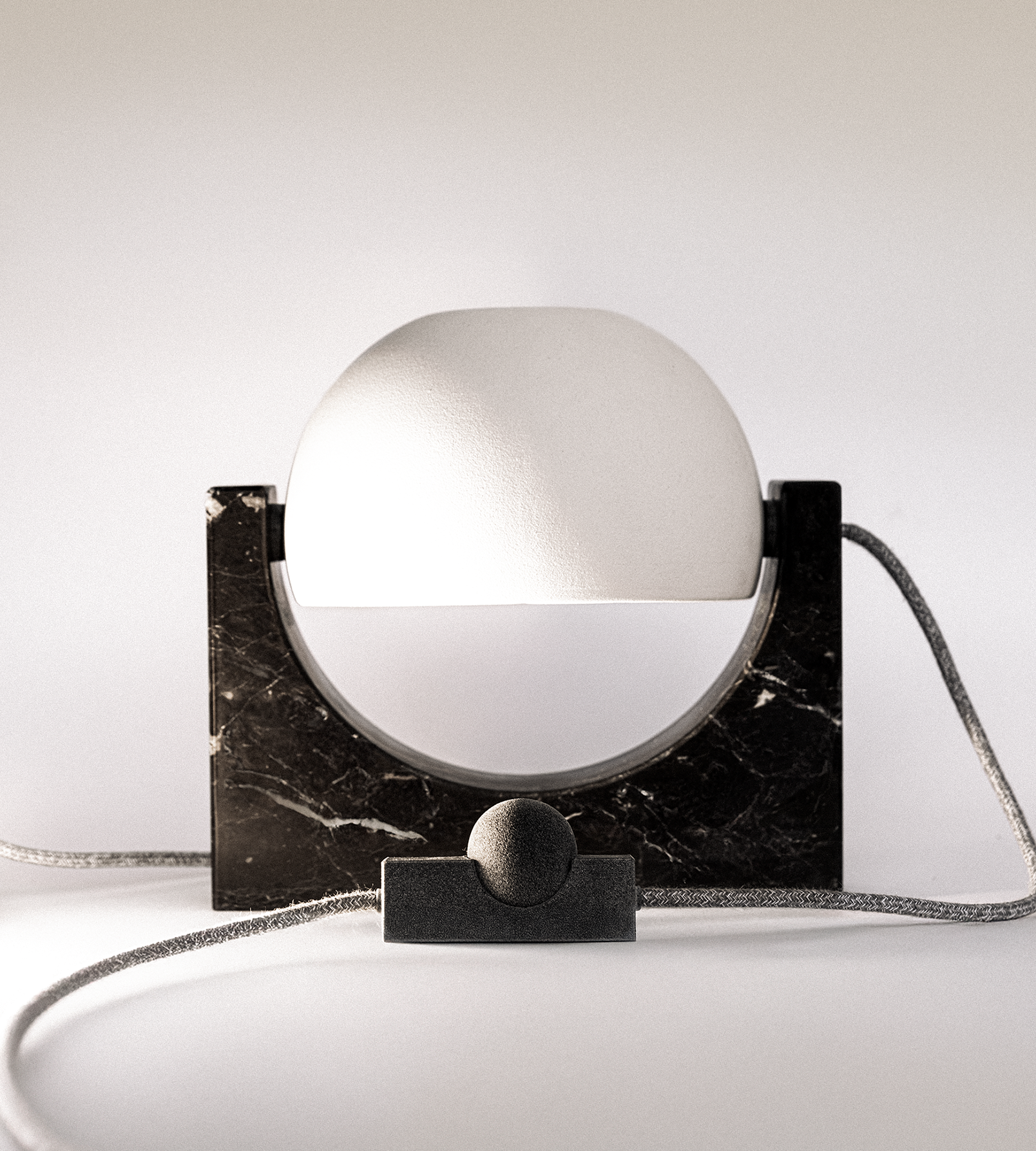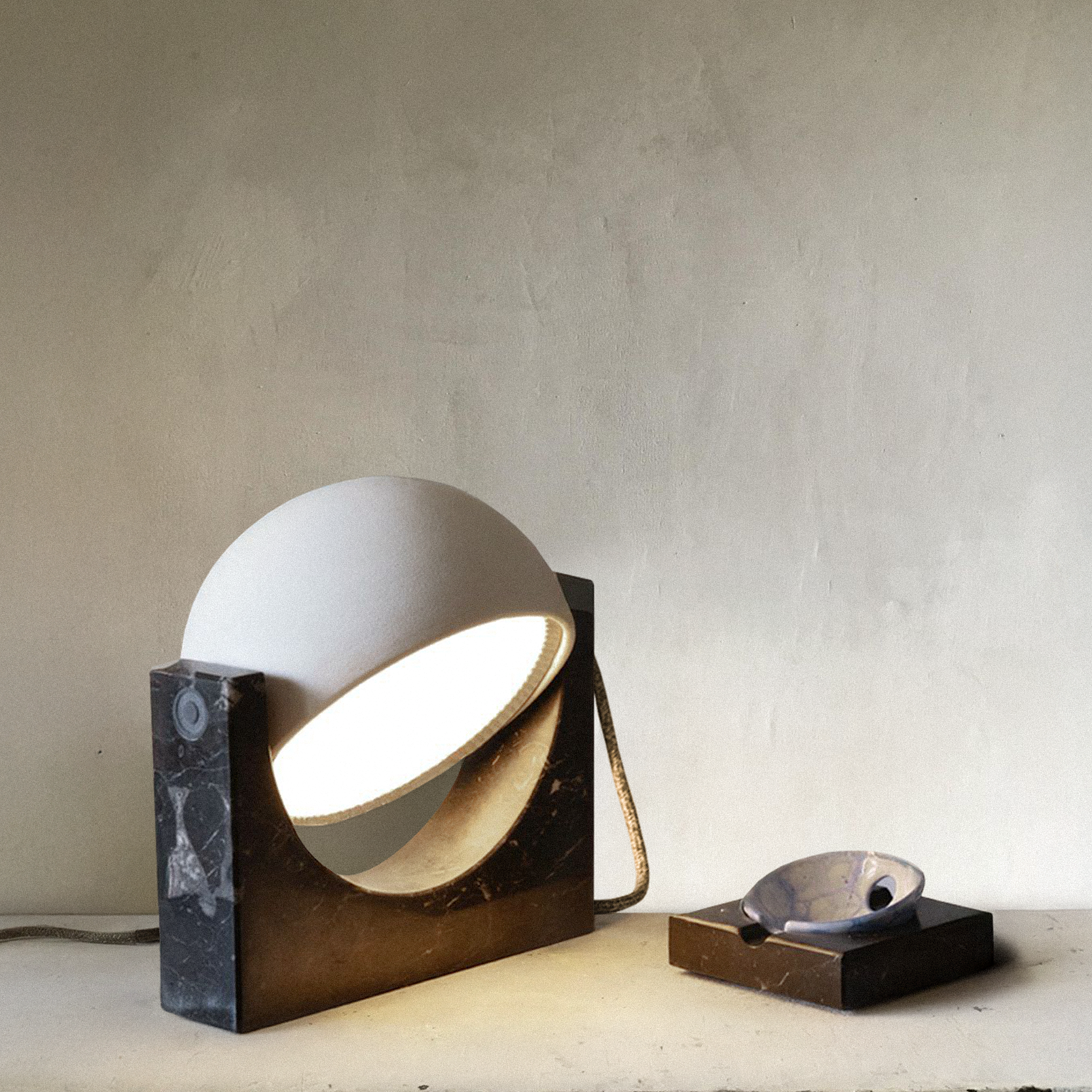 Le geometrie nascono dall’intersezione delle due figure geometriche semplice: rettangolo e cerchio. La base in marmo conferisce struttura e solidità. Mentre la calotta in ceramica, capace di ruotare a 360°, racchiude una sorgente lumi- nosa LED dimmerabile a luce calda.